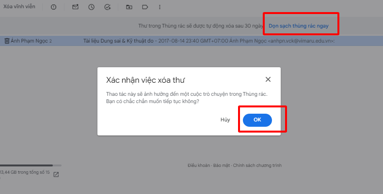 Bước 3: Nhấp vào Thùng rác và xác nhận rằng bạn muốn xóa email. Thận trọng: Sau khi email bị xóa vĩnh viễn ở bước tiếp theo, bạn không thể khôi phục chúng.