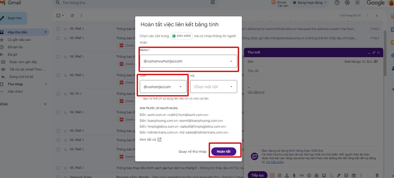 Bước 5: Lúc này, email sẽ trả ra một bảng thông tin và bạn cần điền đúng thông tin như file bảng tính đã sắp xếp, sau đó ấn Hoàn tất