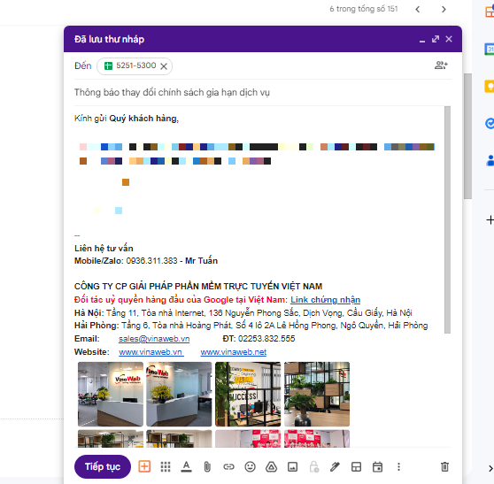Bước 7: Soạn Tiêu đề và Nội dung thông tin email và ấn Tiếp tục