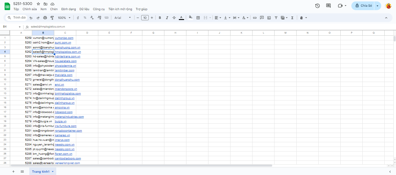 Bước 1: Mở Google trang tính và tạo data danh sách khách hàng của bạn theo thứ tự các cột là: Số thứ tự - Email khách hàng - Tên khách hàng