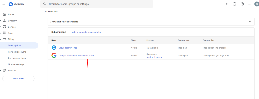 - Bước 2: Truy cập vào phần thanh toán https://admin.google.com/u/0/ac/billing/subscriptions