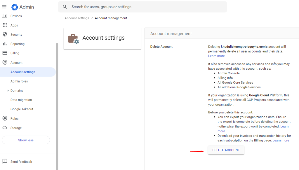 Sau khi đã xóa gói đăng ký, bạn vào phần cài đặt tài khoản, chọn quản lý tài khoản: https://admin.google.com/u/0/ac/companyprofile/accountmanagement