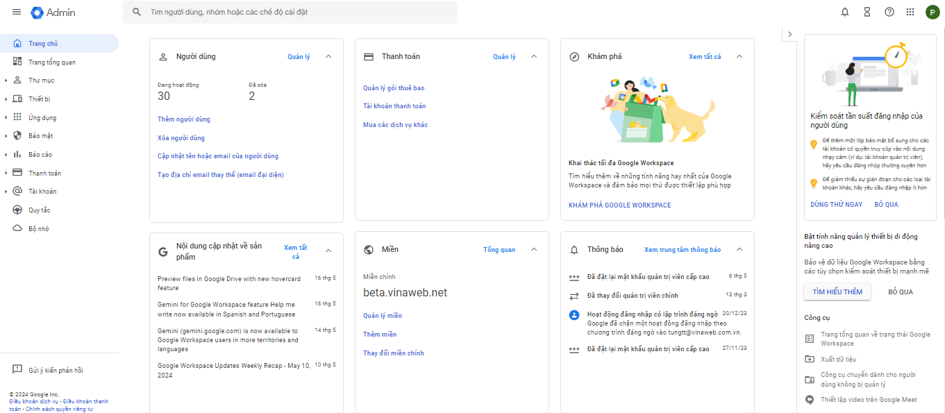 - Bạn truy theo đường link: admin.google.com. Sau đó điền email đăng nhâp và mật khẩu. Giao diện admin sau khi đăng nhập sẽ hiện ra như sau: