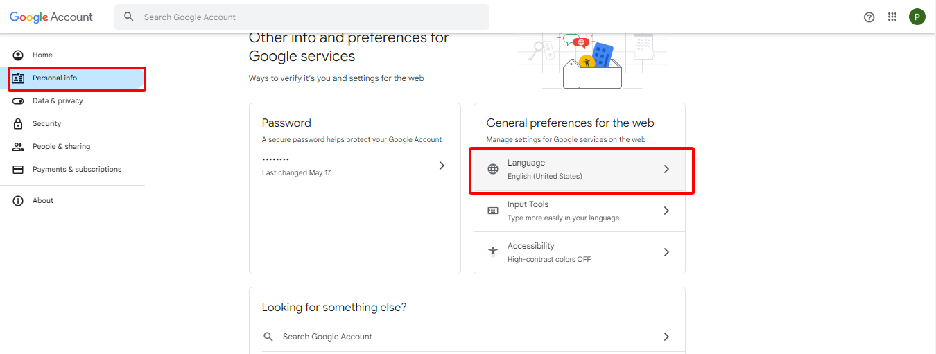 Bước 4: Trong giao diện quản lý tài khoản cùa Google, chọn Personal info và kéo xuống phần Language