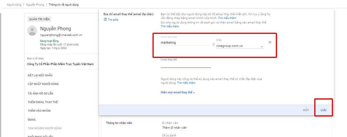 Bước 4: Điền email thay thế và ấn Lưu lại