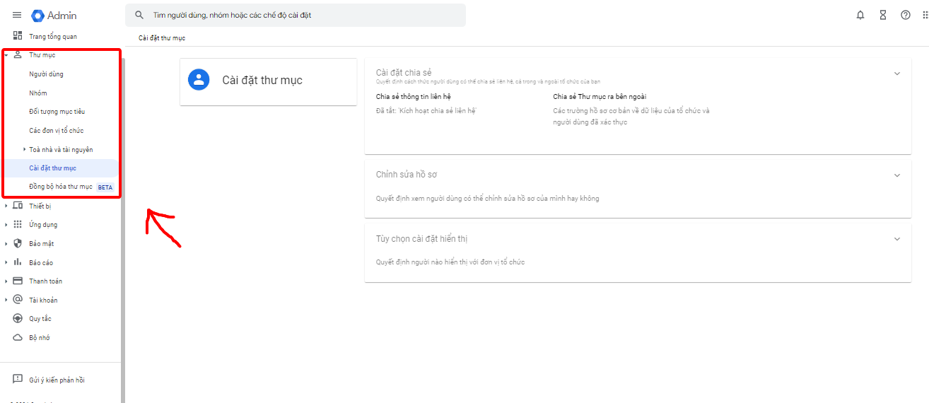 Bước 1: Sau khi đăng nhập tài khoản admin Google Workspace, bạn truy cập Thư mục -> Cài đặt thư mục