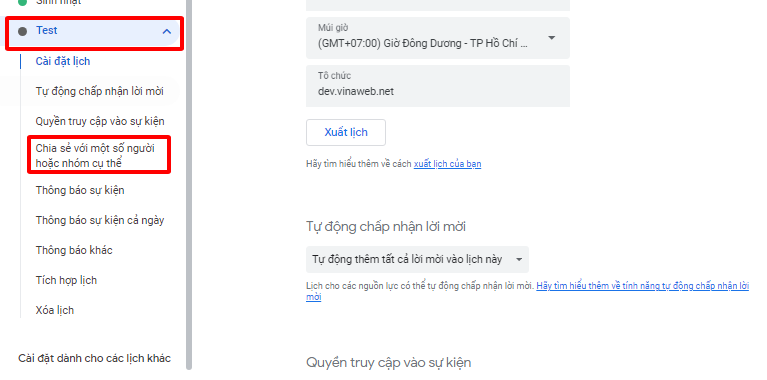 Nếu muốn chia sẻ lịch của mình thì nhấn vào lịch đó ở thanh bên trái, sau đó chọn Chia sẻ với những người cụ thể.