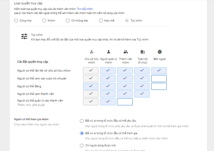 - Bước 5: Cài đặt thêm tính năng Quyền truy cập và Các thành viên tham gia nhóm