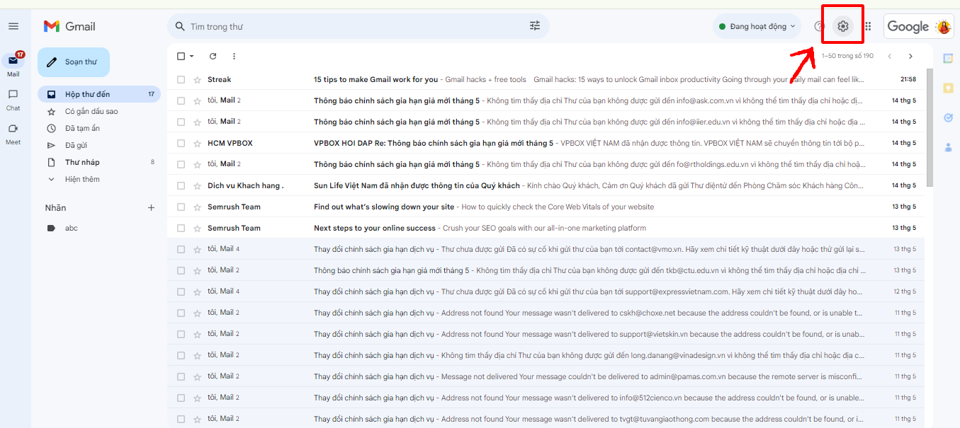 - Nhấp vào biểu tượng "Cài đặt" (hình bánh răng) ở góc trên bên phải của trang Gmail.