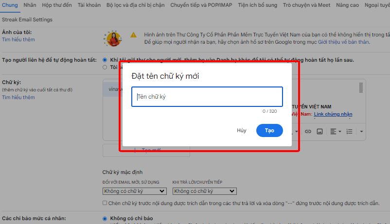 - Nhập tên cho chữ ký của bạn (ví dụ: Chữ ký công việc, Chữ ký cá nhân).