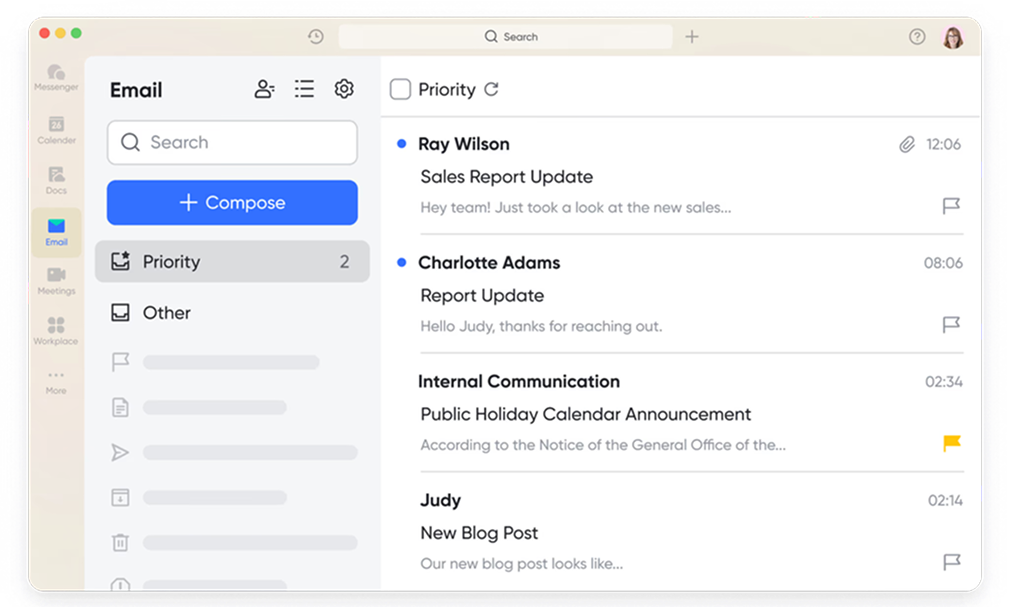 Lark Mail ứng dụng AI để tự động gắn thẻ và phân loại email quan trọng, đặc biệt là thư từ đối tác, khách hàng hoặc cấp quản lý. Người dùng dễ dàng tập trung vào những nội dung cần xử lý trước, hạn chế bỏ sót các email mang tính quyết định.