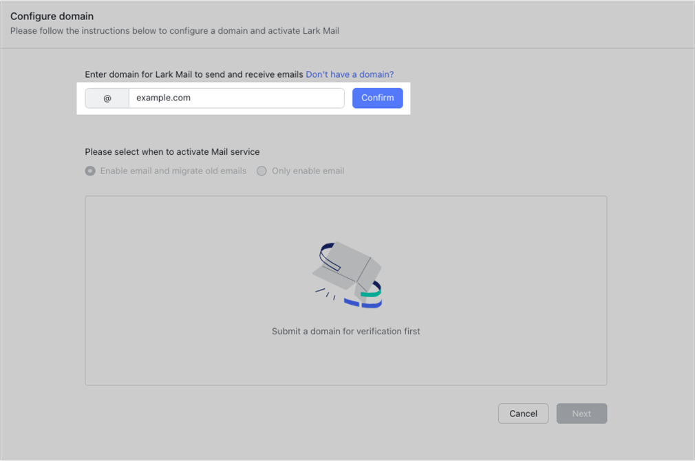 Lark Mail hỗ trợ sử dụng địa chỉ email theo tên miền riêng của doanh nghiệp (ví dụ: name@yourcompany.com), giúp xây dựng hình ảnh chuyên nghiệp và thống nhất trong mọi hoạt động giao tiếp với đối tác, khách hàng.