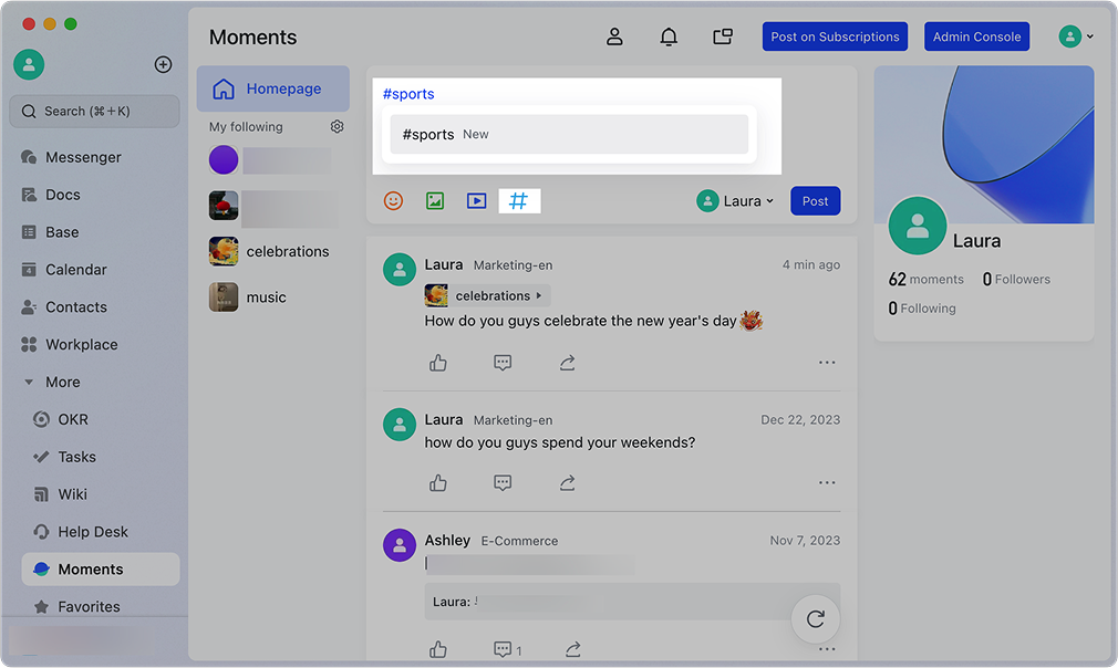 Lark Moments hỗ trợ hashtag và topic để phân loại nội dung theo chủ đề như #TeamBuilding, #KnowledgeSharing hay #KhenNgoi. Nhờ đó, nhân viên dễ dàng theo dõi các mảng nội dung mình quan tâm, đồng thời giúp doanh nghiệp xây dựng dòng chảy thông tin rõ ràng và có tổ chức.