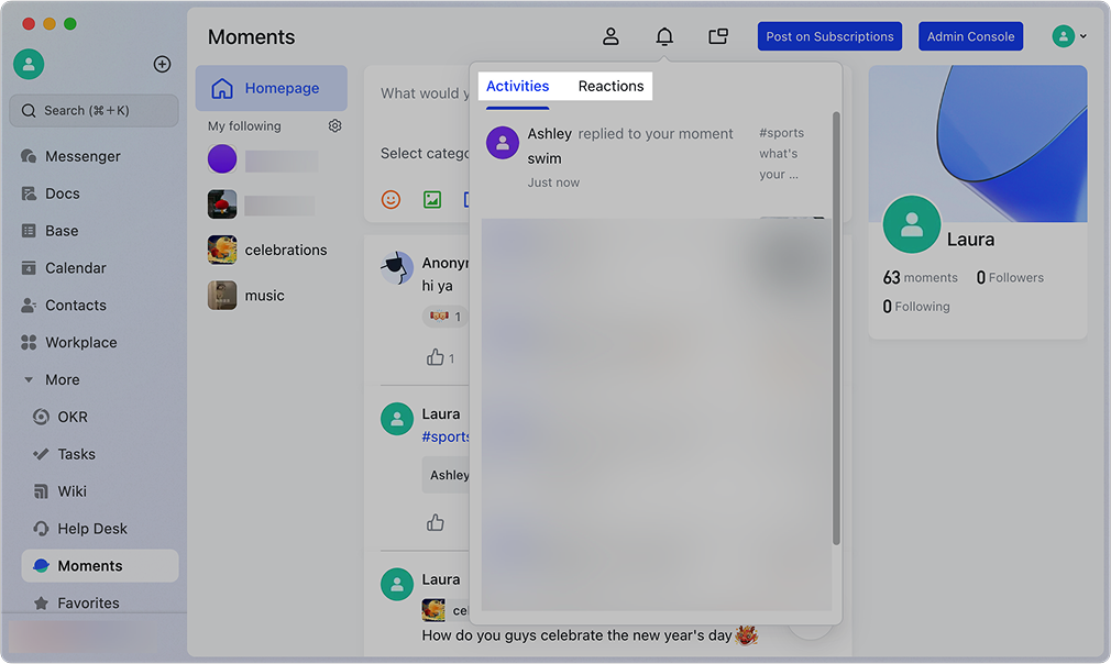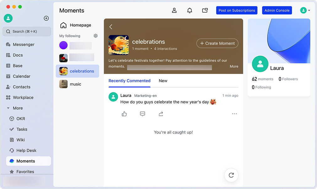 Lark Moments ra đời như một mạng xã hội nội bộ được tích hợp sẵn trong Lark, nơi nhân viên có thể chia sẻ tin tức nội bộ, những khoảnh khắc đời thường, hoạt động đội nhóm hay các câu chuyện truyền cảm hứng. Thay vì phải sử dụng các nền tảng bên ngoài, mọi tương tác đều diễn ra ngay trong không gian làm việc chung, an toàn và có kiểm soát.