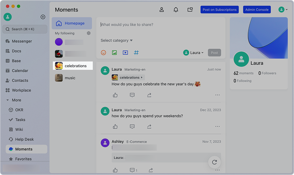 Lark Moments cung cấp bảng tin nội bộ hiển thị các bài viết từ đồng nghiệp và ban lãnh đạo theo dòng thời gian hoặc mức độ quan tâm. Nhân viên có thể nhanh chóng nắm bắt hoạt động chung của tổ chức, từ thông báo công việc, chia sẻ kiến thức đến các khoảnh khắc đời thường, giúp thông tin lan tỏa tự nhiên và không bị bỏ sót.