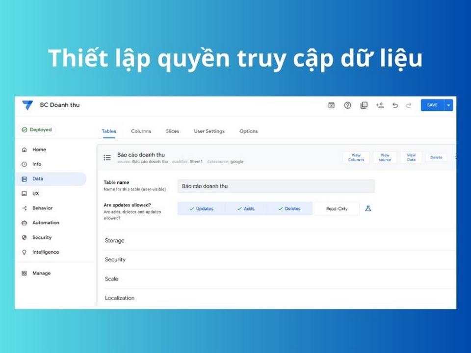 - Bảo mật dữ liệu: AppSheet cung cấp các cơ chế bảo mật dữ liệu để bảo vệ thông tin nhạy cảm. Việc này bao gồm xác thực người dùng, kiểm soát quyền truy cập, và mã hóa dữ liệu.