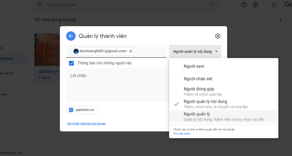 Xác định những quyền sử dụng trong Shared Drive của Google Drive
