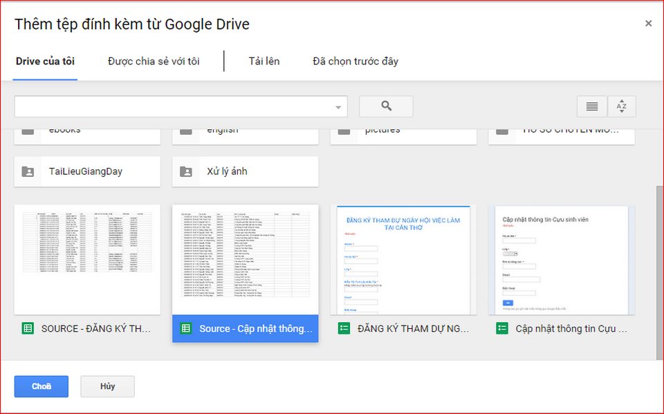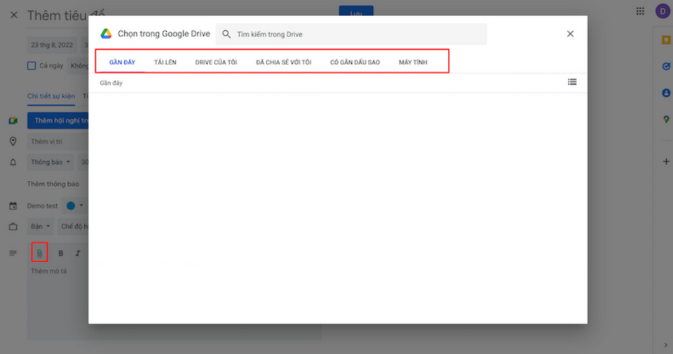 Như vậy, Google calendar sẽ cho bạn các lựa chọn: Gần đây/Tải lên từ máy/Drive của tôi…Bạn chỉ cần chọn mục có chứa tài liệu và tải lên là được.
