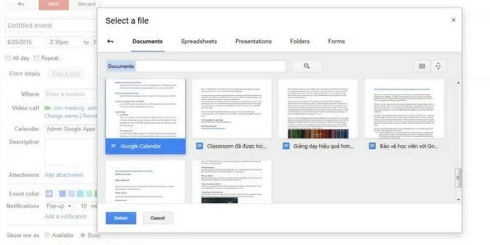 Tính năng đính kèm tài liệu trong Google Calendar