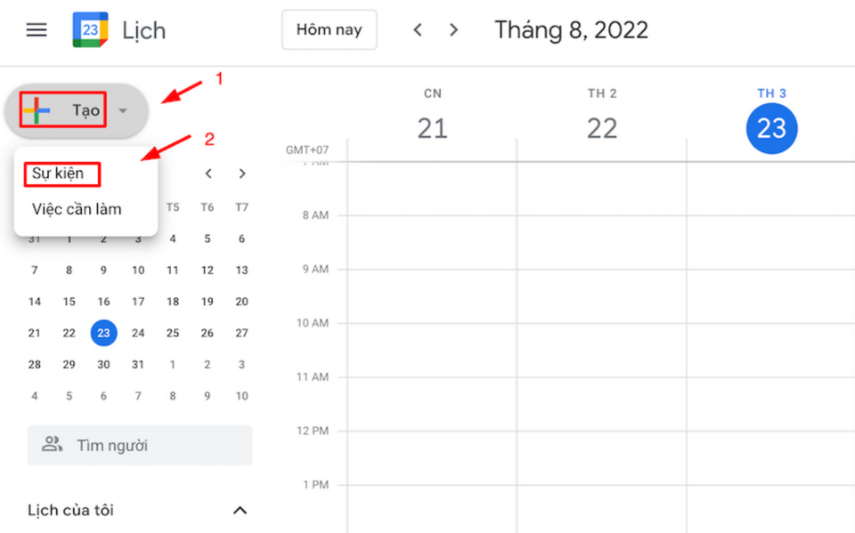 - Bước 1: Bạn hãy truy cập vào giao diện chính của ứng dụng Google Calendar, nhấp chuột vào ngày + khung giờ của sự kiện. Sau đó, hãy tiếp tục nhấp chuột vào chữ “+Tạo” phía trên góc trái màn hình.