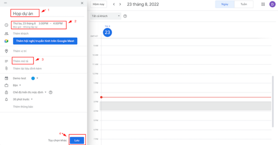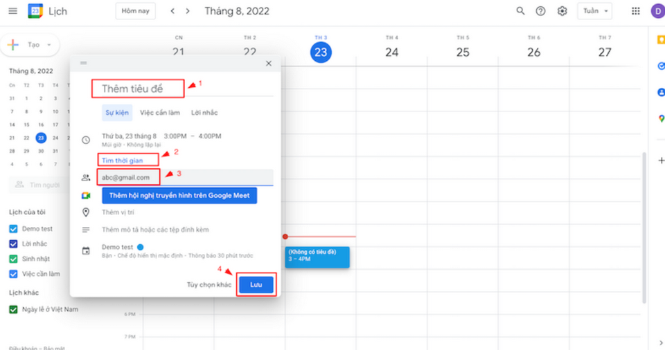 - Bước 2: Sau đó, chúng ta cần chọn mục “sự kiện” để Đặt tên tiêu đề. Lần lượt thực hiện các yêu cầu hiển thị trên giao diện như Điều chỉnh thời gian diễn ra sự kiện, Những việc cần làm (nếu cần), Đổi màu (nếu cần), cuối cùng, bạn chỉ cần bấm nút “Lưu”