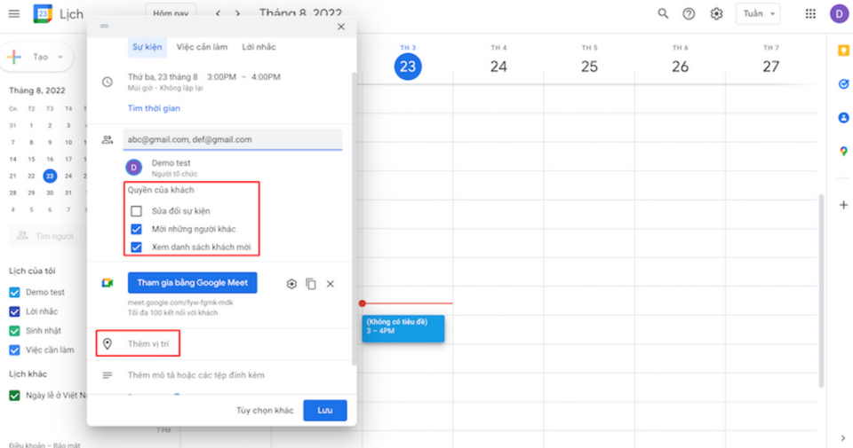 - Bước 4: Hãy quan sát phần “thêm khách” và điền địa chỉ email các thành viên tham gia.