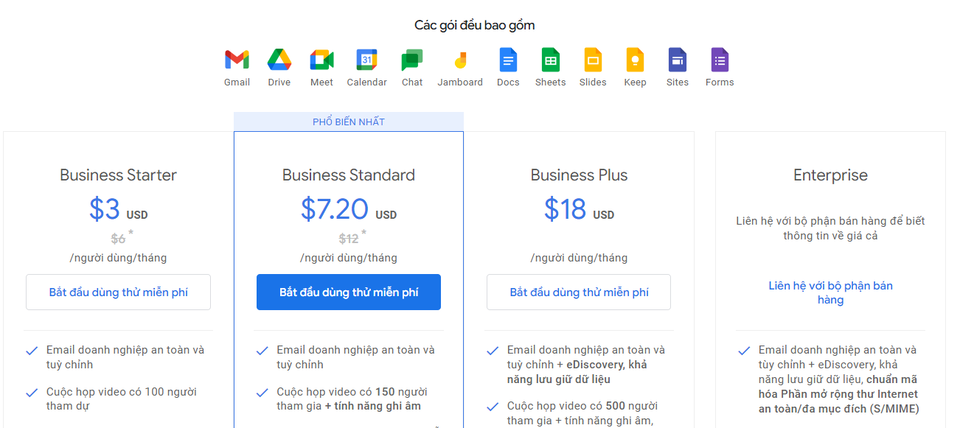 Các gói Email doanh nghiệp google