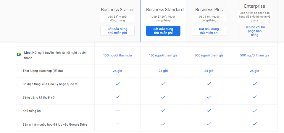 - Nâng cấp tài khoản Google Workspace: Để tăng số lượng người tham gia và kéo dài thời gian cuộc họp, bạn có thể đăng ký các gói Google Workspace như Essentials, Business Standard hoặc Enterprise.