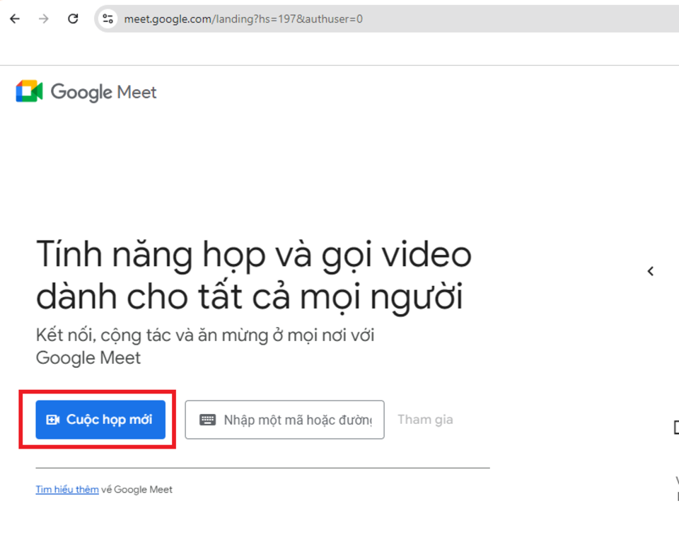 - Bước 1: Truy cập vào trang web chính thức của Google Meet và đăng nhập vào tài khoản Google của bạn. Tiếp theo nhấn vào nút “Cuộc họp mới”.
