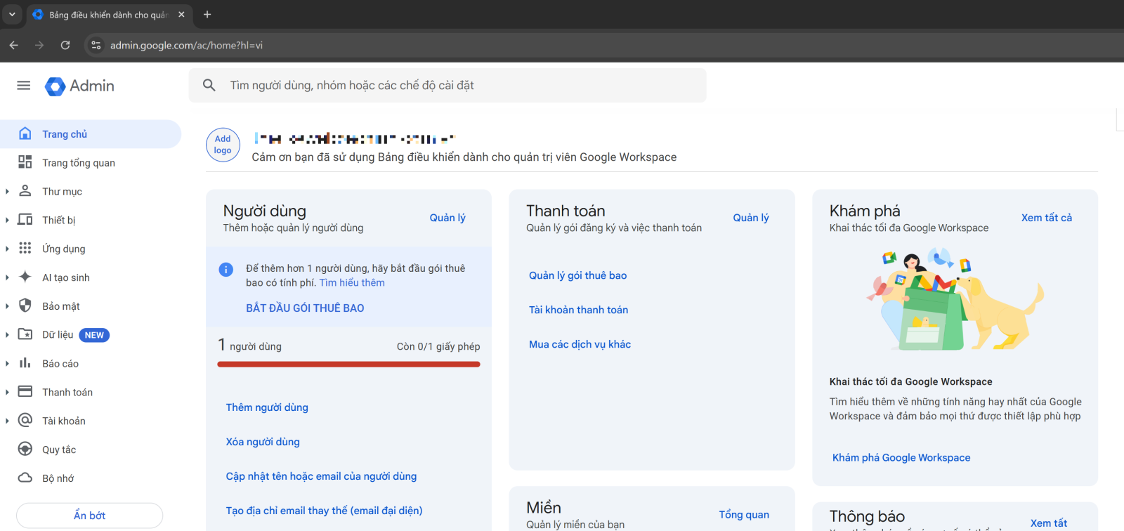 1. Truy cập vào trang quản trị của Google Workspace, link truy cập admin.google.com và đăng nhập bằng tài khoản quản trị viên cấp cao.