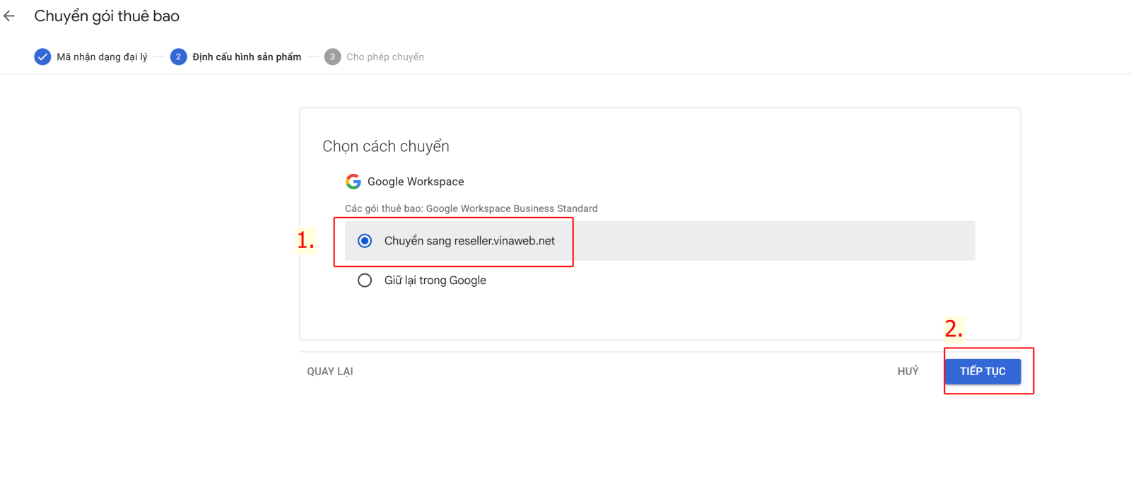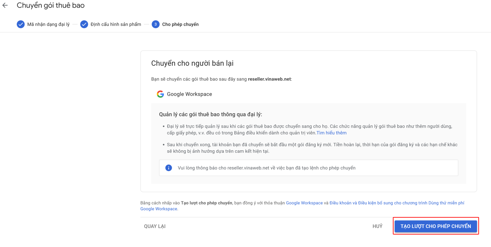 Để thêm mã đại lý và chuyển về Vinaweb cho tài khoản Google Workspace của bạn, bạn cần thực hiện các bước sau:
