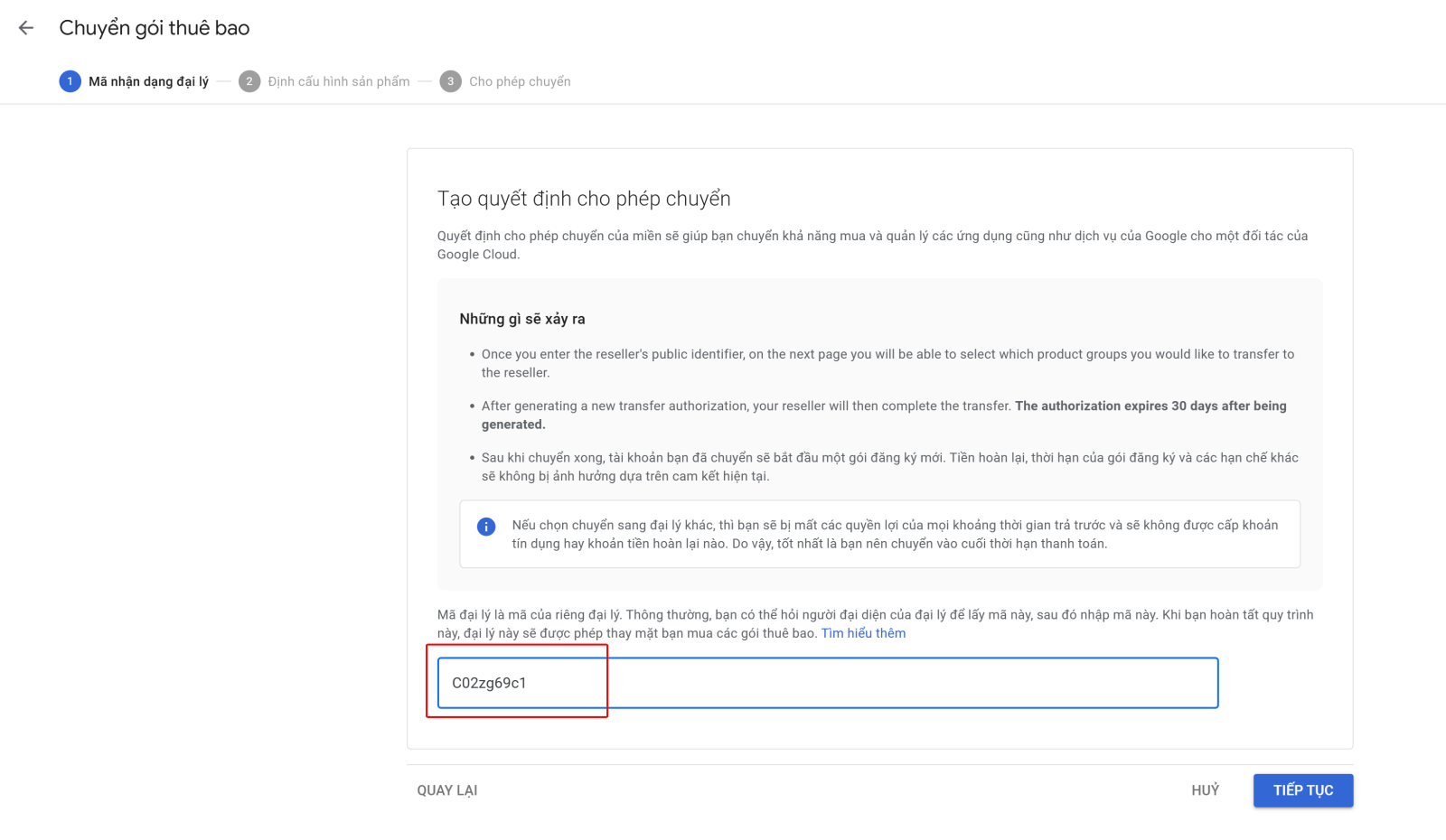 4. Sau khi bấm chuyển sẽ phần thêm mã đại lý. Mã đại lý của Vinaweb: C02zg69c1, Bạn nhập mã đại lý vào ô như trong ảnh và bấm tiếp tục