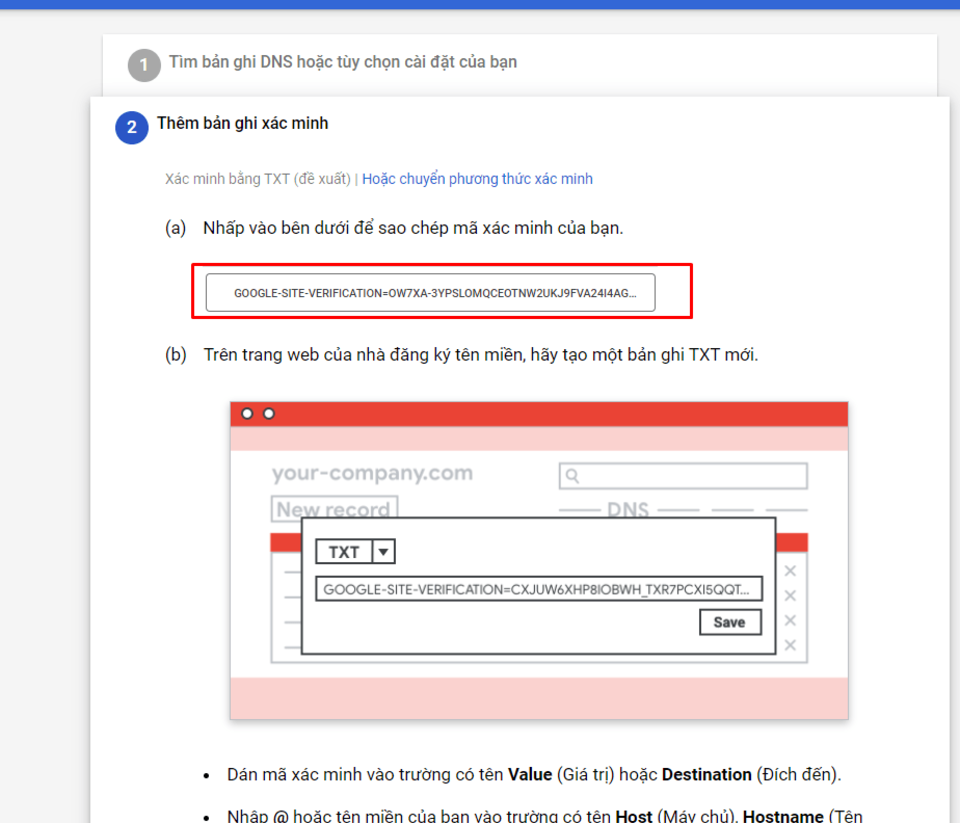 Tiếp theo bạn cần xác minh quyền sở hữu tên miền. Google sẽ yêu cầu xác minh quyền sở hữu tên miền để đảm bảo bạn có quyền sử dụng tên miền đó. Thực hiện theo hướng dẫn của Google, thường bằng cách thêm một bản ghi DNS hoặc tải lên một tệp HTML lên máy chủ của bạn.