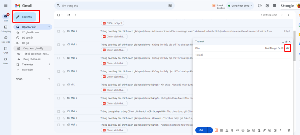 Sau khi đã chuẩn bị dữ liệu, bạn đăng nhập vào tài khoản Google Workspace, chọn mục “Soạn thư”. Trong cửa sổ soạn thư, hãy chọn biểu tượng 2 người ở trên cùng góc phải cho tính năng gửi mail hàng loạt.