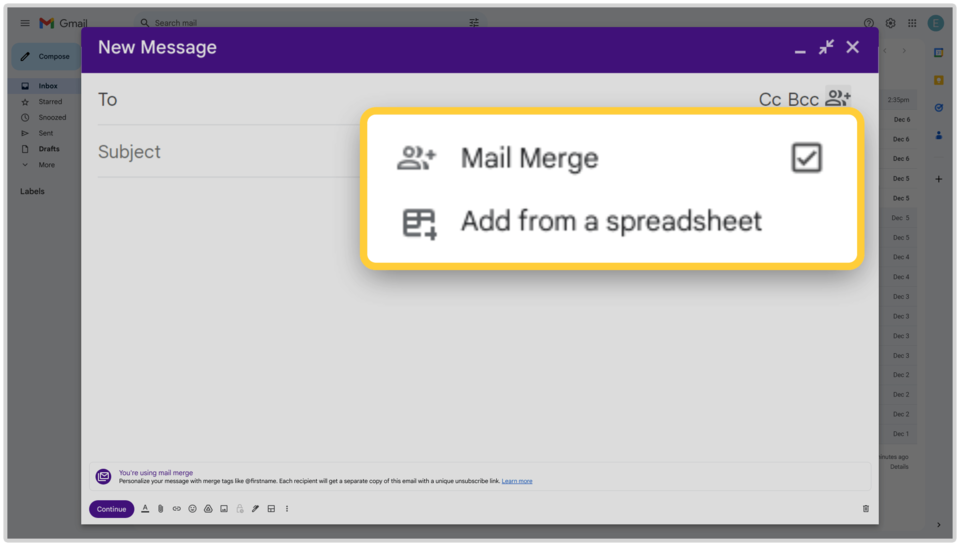 Tích chọn “Hợp nhất thư” và sau đó chọn tùy chọn “Thêm từ một bảng tính”. Đây là tính năng giúp bạn hợp nhất dữ liệu từ danh sách khách hàng đã tạo trong Google trang tính.