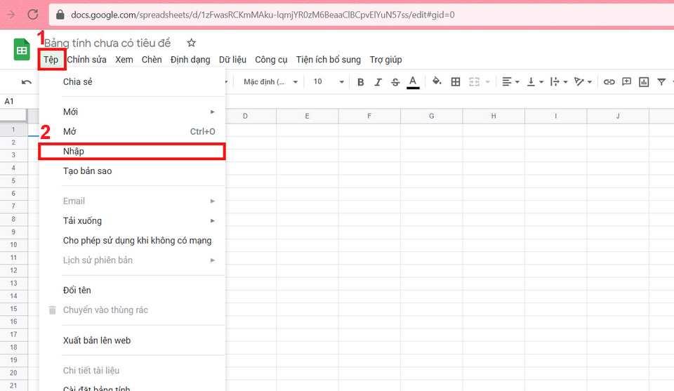 - Khi chúng ta đã tạo được Google Trang tính, hãy chọn tiếp mục Tệp và nhấn vào mục Nhập.