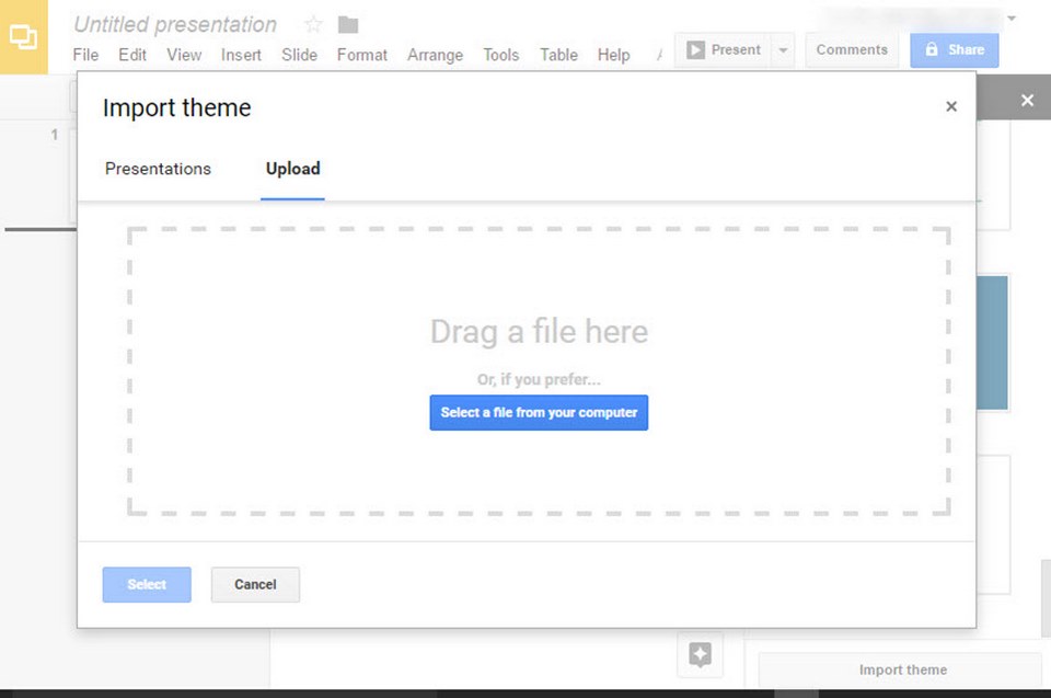 Nếu muốn tải một chủ đề gốc vào Google Slides, bạn hãy nhấn nút Import theme. Quan sát cửa sổ Nhập chủ đề đang hiển thị trên giao diện, chúng ta được dùng một chủ đề trước với thao tác di chuyển chuột vào một loại chủ đề trên cửa sổ. Ngoài ra, người dùng cũng có thể nhấn mục Chọn tệp từ máy tính của bạn.