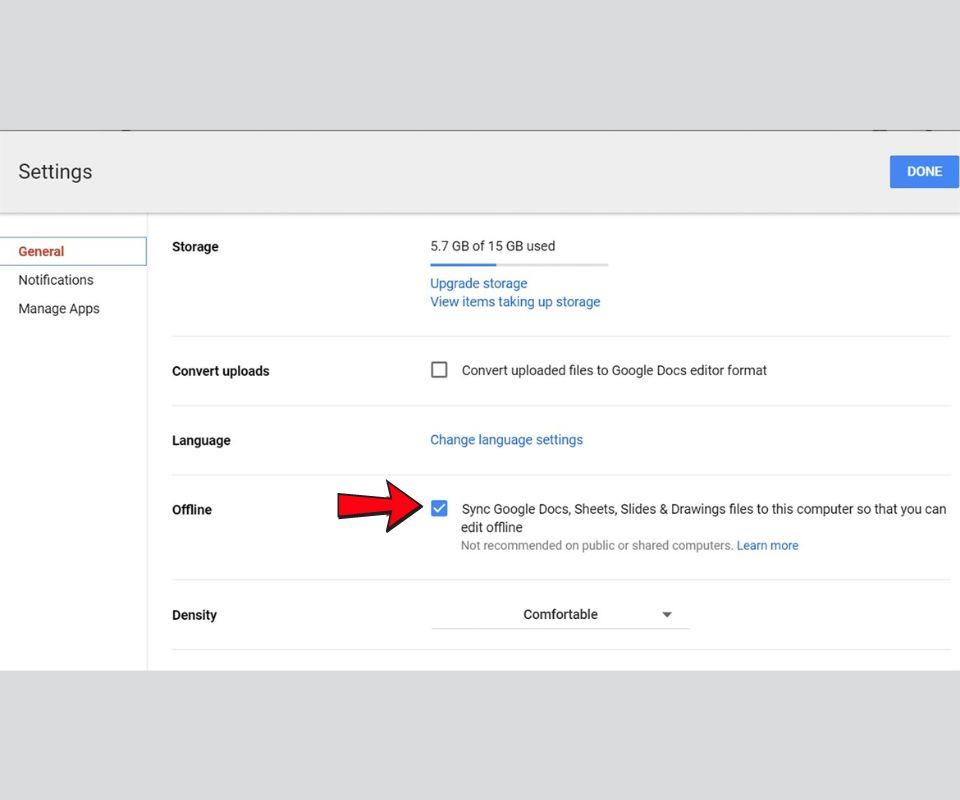 - Bước 2: Truy cập vào Google Drive, đi đến phần "Cài đặt" và chọn “Offline”. Đánh dấu tích vào mục "Đồng bộ hóa các tệp tin Google Docs, Sheets, Slides và Drawings để chỉnh sửa ngoại tuyến". Sau đó, chờ vài phút để tính năng này được kích hoạt.