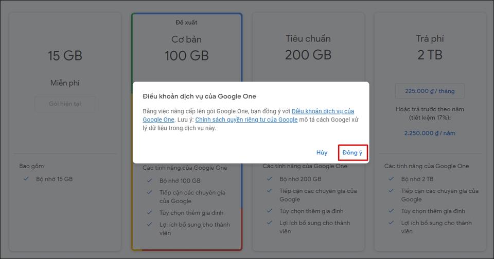 Google Drive cung cấp dung lượng miễn phí lên đến 15GB. Tuy nhiên với các doanh nghiệp hay cá nhân có nhu cầu sử dụng cao hơn có thể mua các gói nâng cấp. Chi phí các gói này được trả theo tháng, với 100GB dung lượng bạn phải trả 45.000VNĐ/tháng.