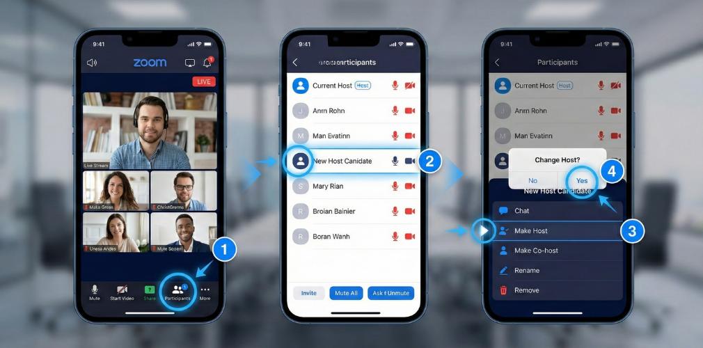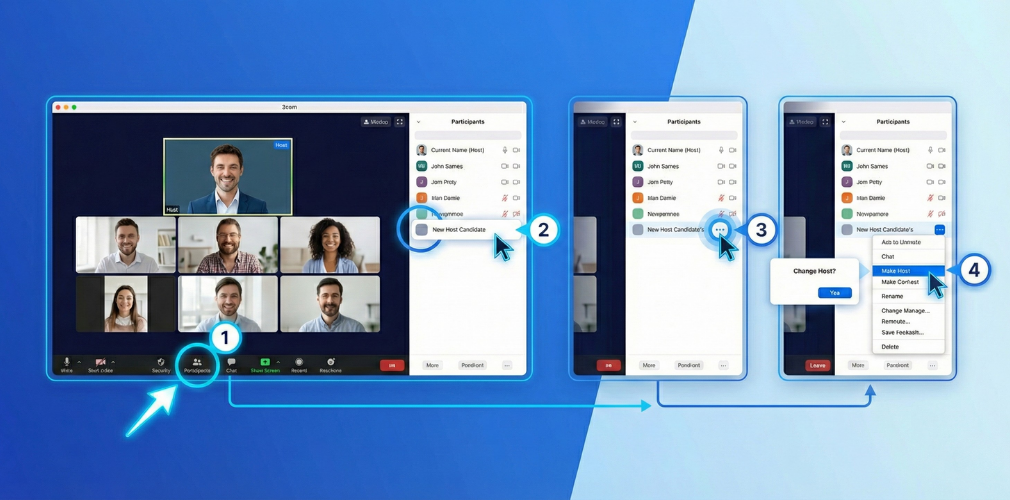 Host hiện tại phải thực hiện chuyển quyền: Chỉ Host mới có quyền chuyển vai trò Host cho người khác. Co-host hoặc người tham gia thông thường không thể tự chuyển quyền Host.