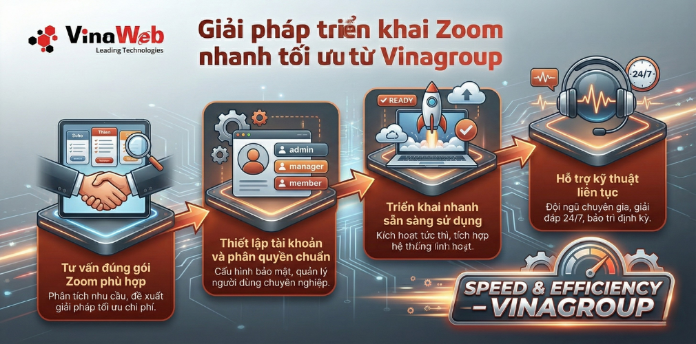 Với nhu cầu dạy học, họp trực tuyến và đào tạo online ngày càng tăng, việc triển khai Zoom nhanh – đúng chuẩn – ổn định là yếu tố then chốt. Vinagroup mang đến giải pháp triển khai Zoom trọn gói, giúp tổ chức, doanh nghiệp và cơ sở giáo dục sử dụng Zoom hiệu quả ngay từ ngày đầu.